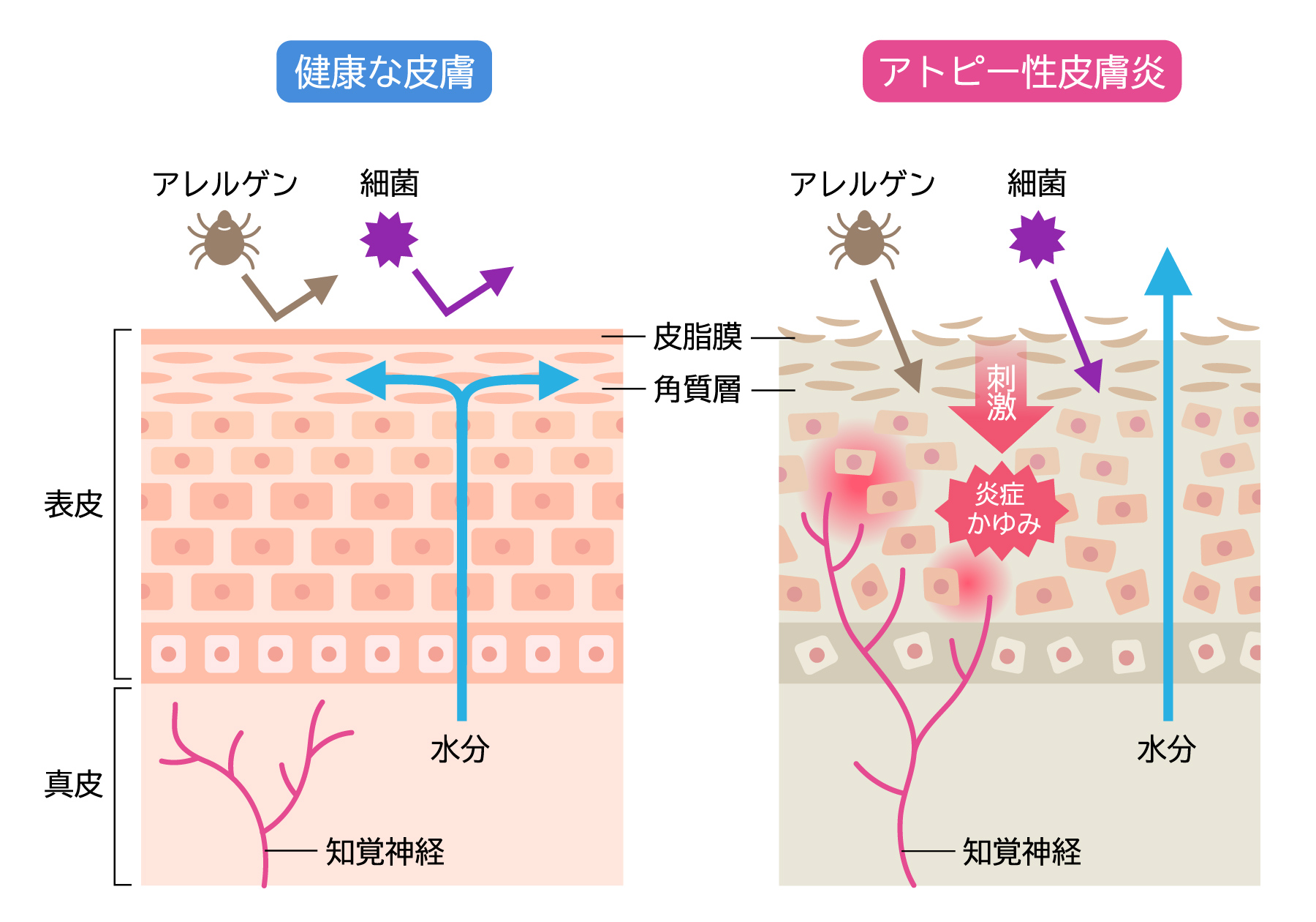 努力の成果を無駄にしないためにも、まずは簡単に乾燥肌やアトピー性皮膚炎のメカニズムを知っておきましょう。